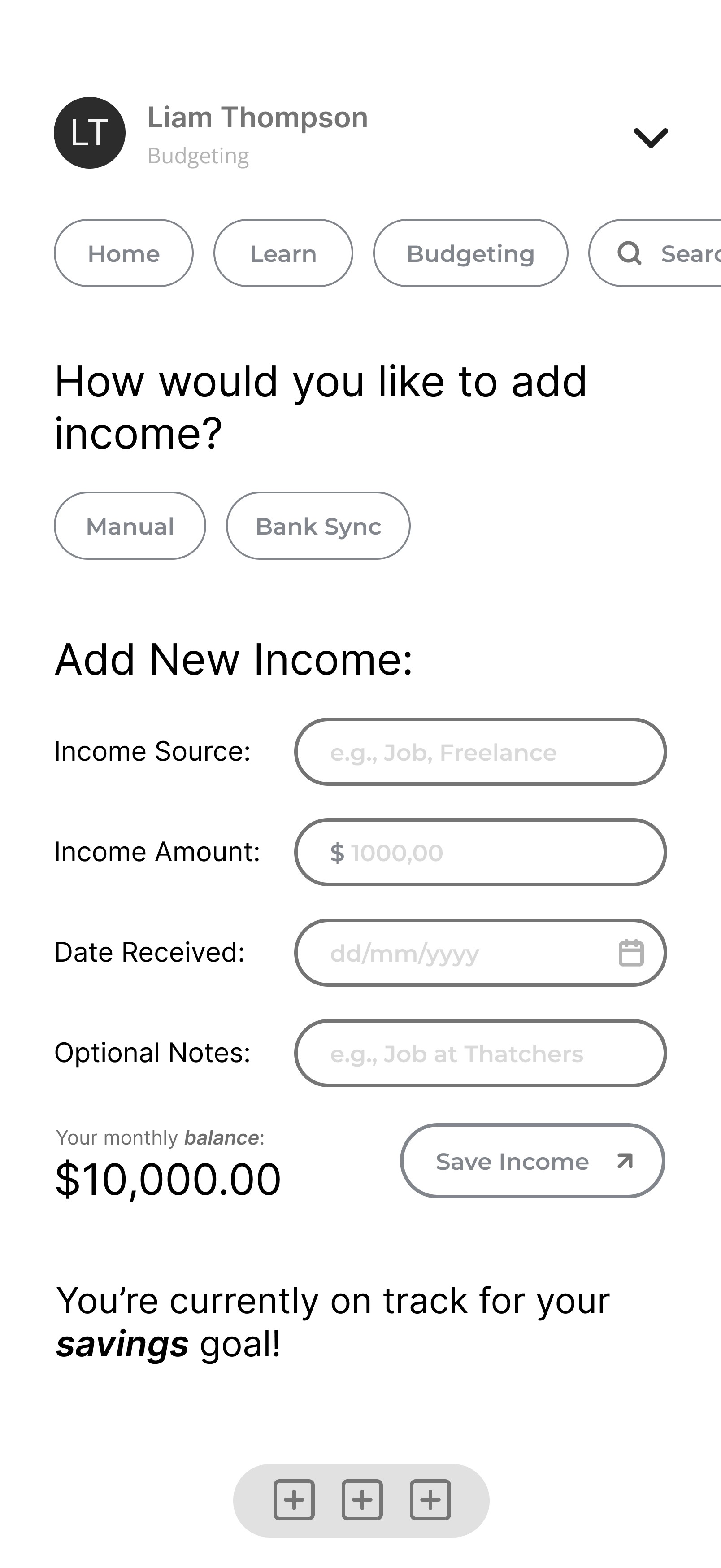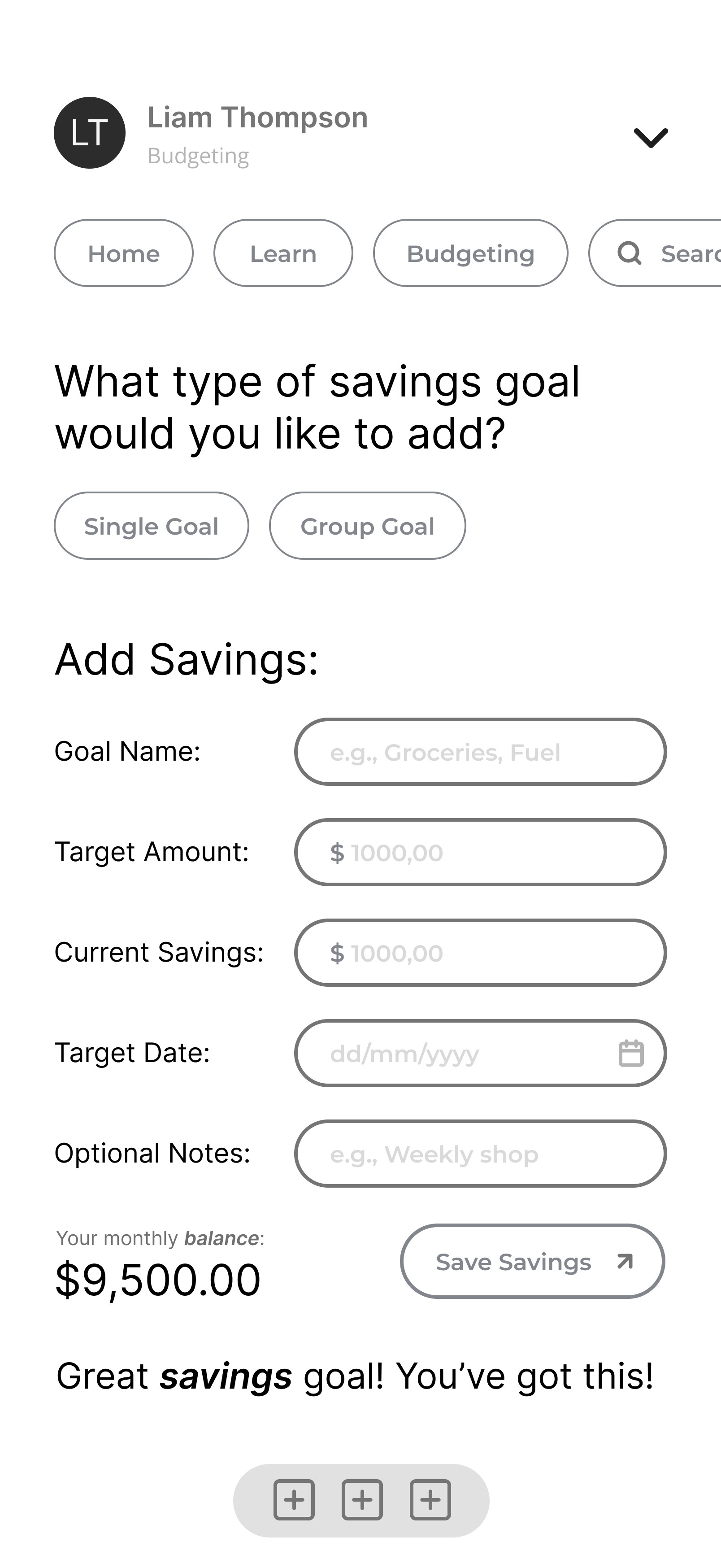 Budgeting input and savings goals.