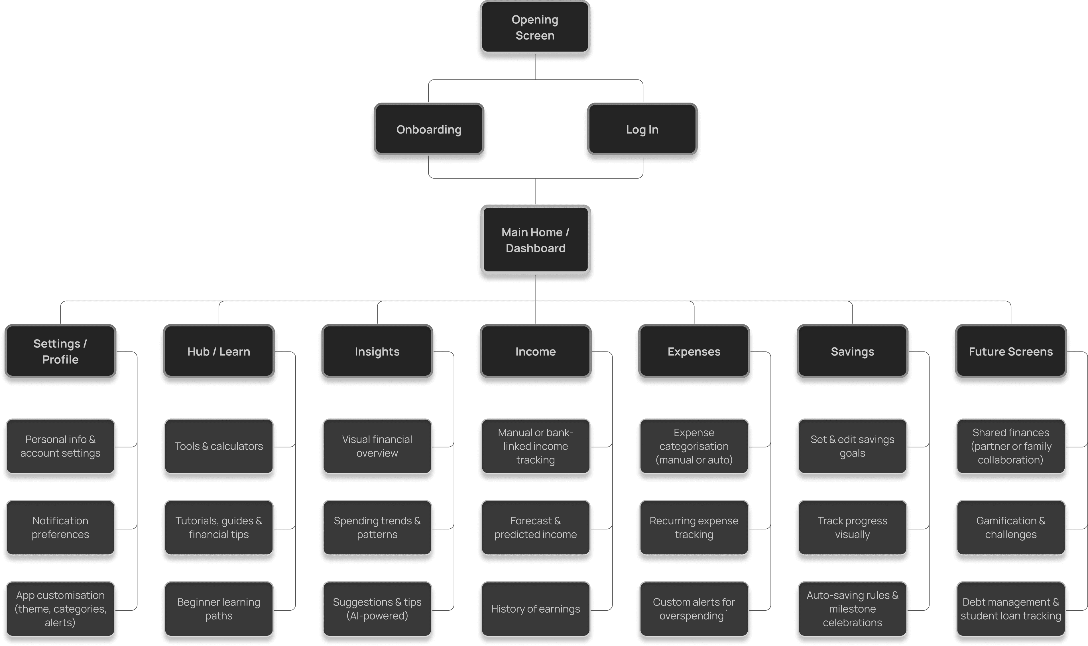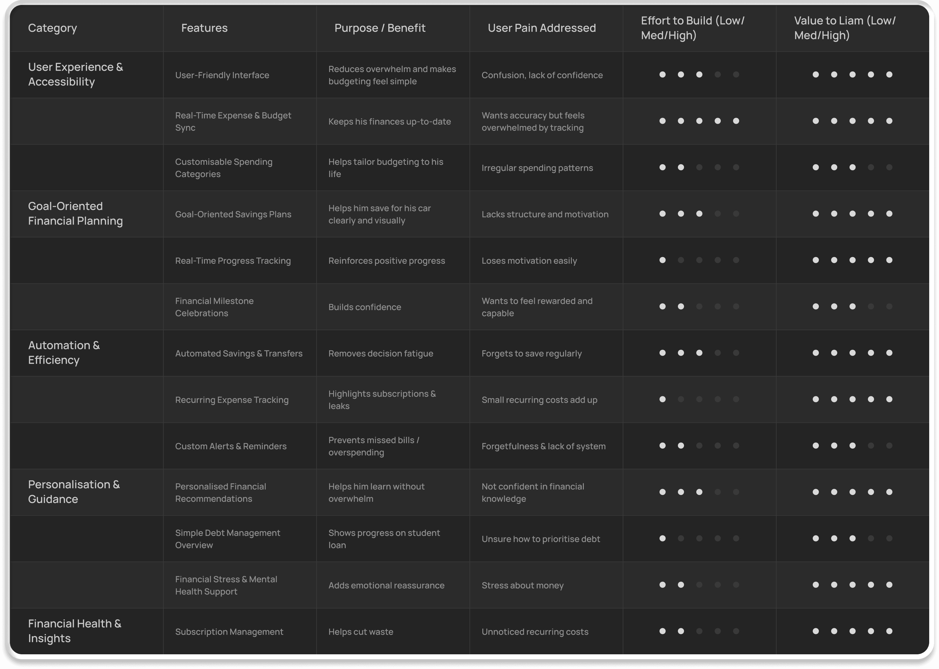 The ideation phase turned insights about Liam into focused design directions, prioritising high-impact, feasible features to support his goal of saving for a car despite irregular spending.