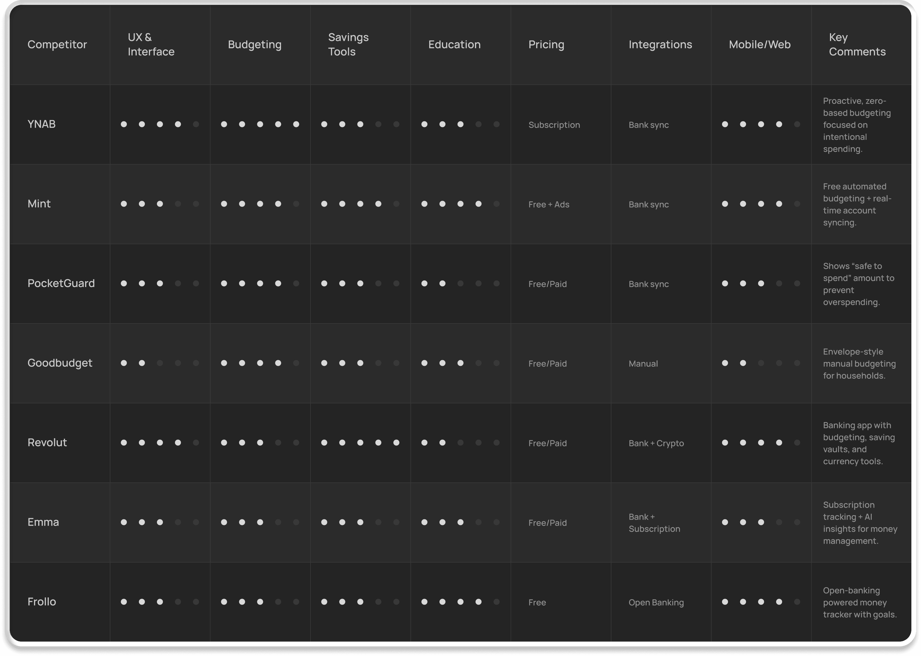 I conducted a competitive feature analysis and supporting desk research to understand the current landscape of budgeting and savings tools. While no existing product fully aligned with the design goals, the audit revealed a range of adjacent solutions, patterns, and opportunities worth leveraging.