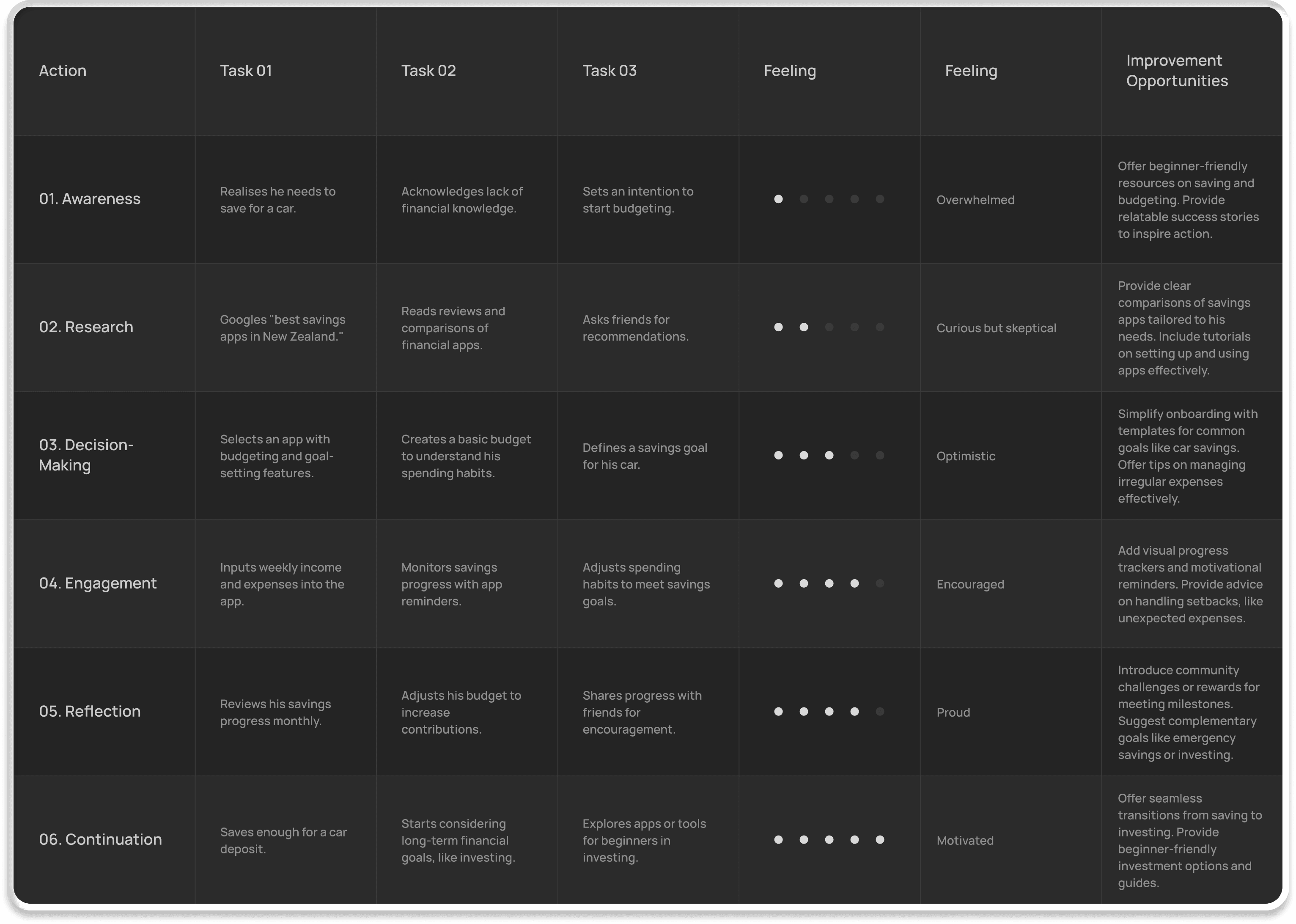 By reducing complexity, automating key tasks, and visualising progress toward goals like purchasing a car, the tool can help Liam feel more in control of his finances and maintain consistent savings without feeling overwhelmed.