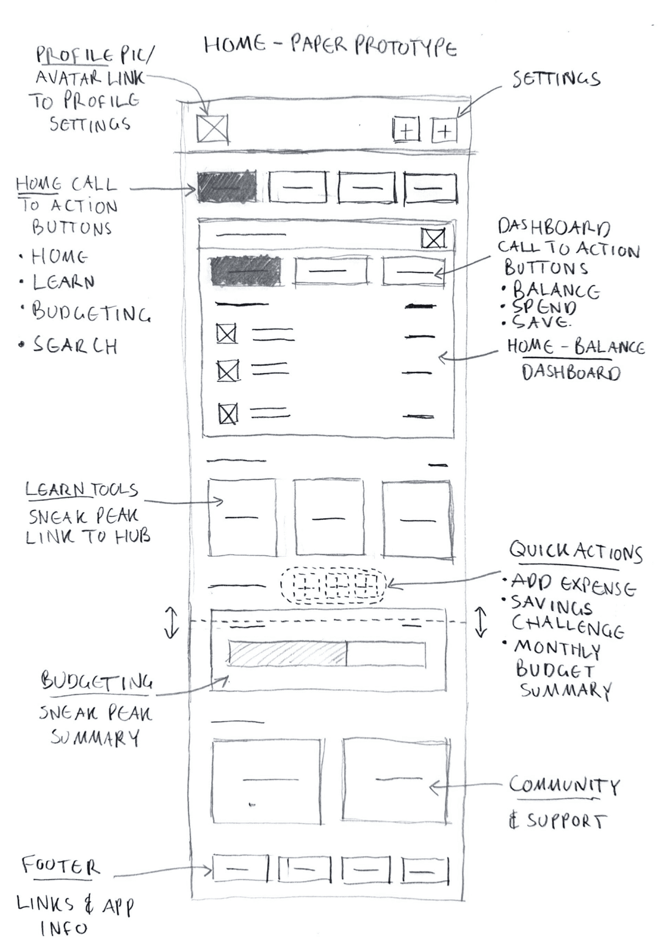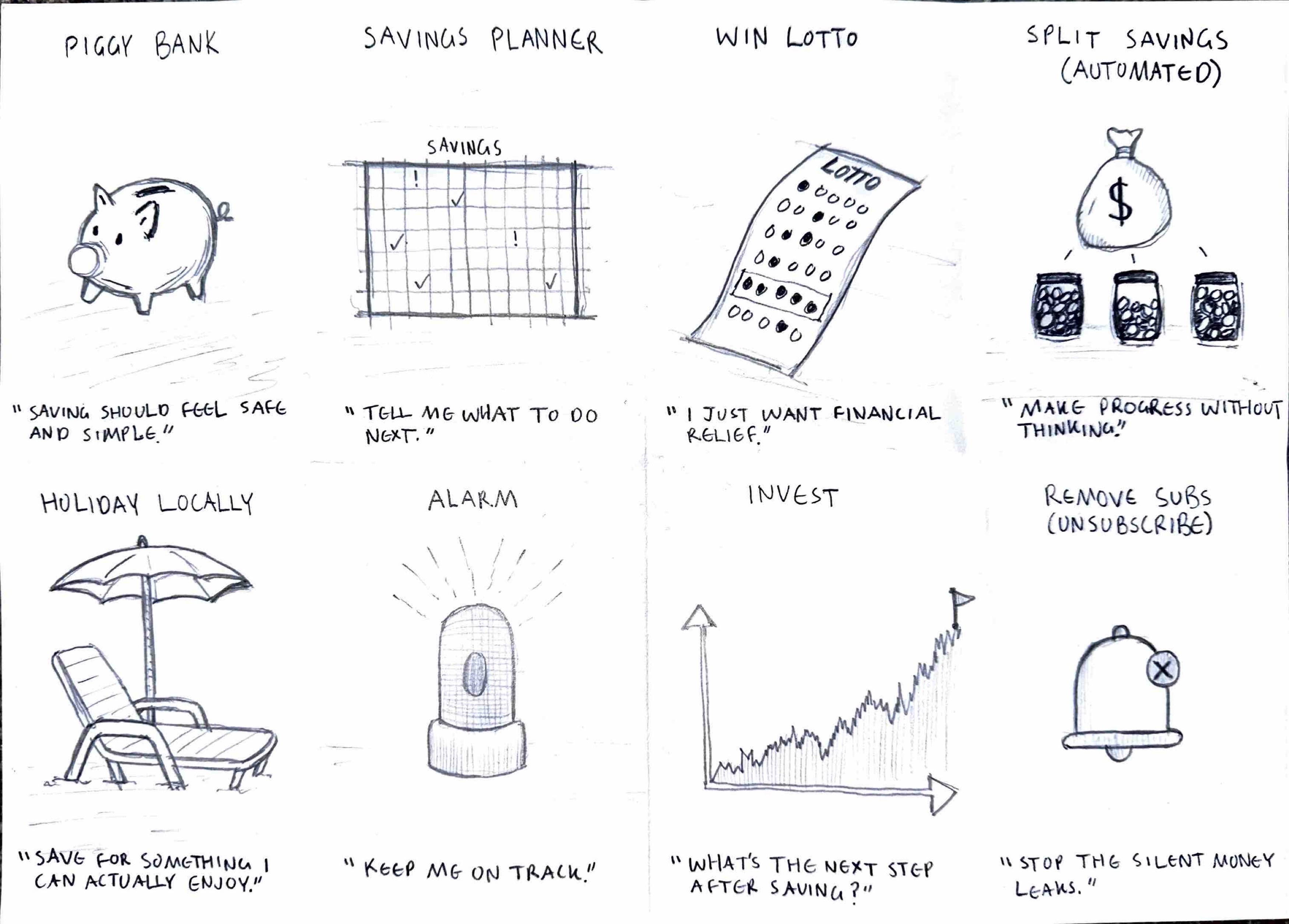 During ideation, we explored multiple approaches to solving Liam’s core problem: building better financial habits and saving for a car despite irregular spending patterns. We used visual thinking and brainstorming techniques to generate diverse ideas.