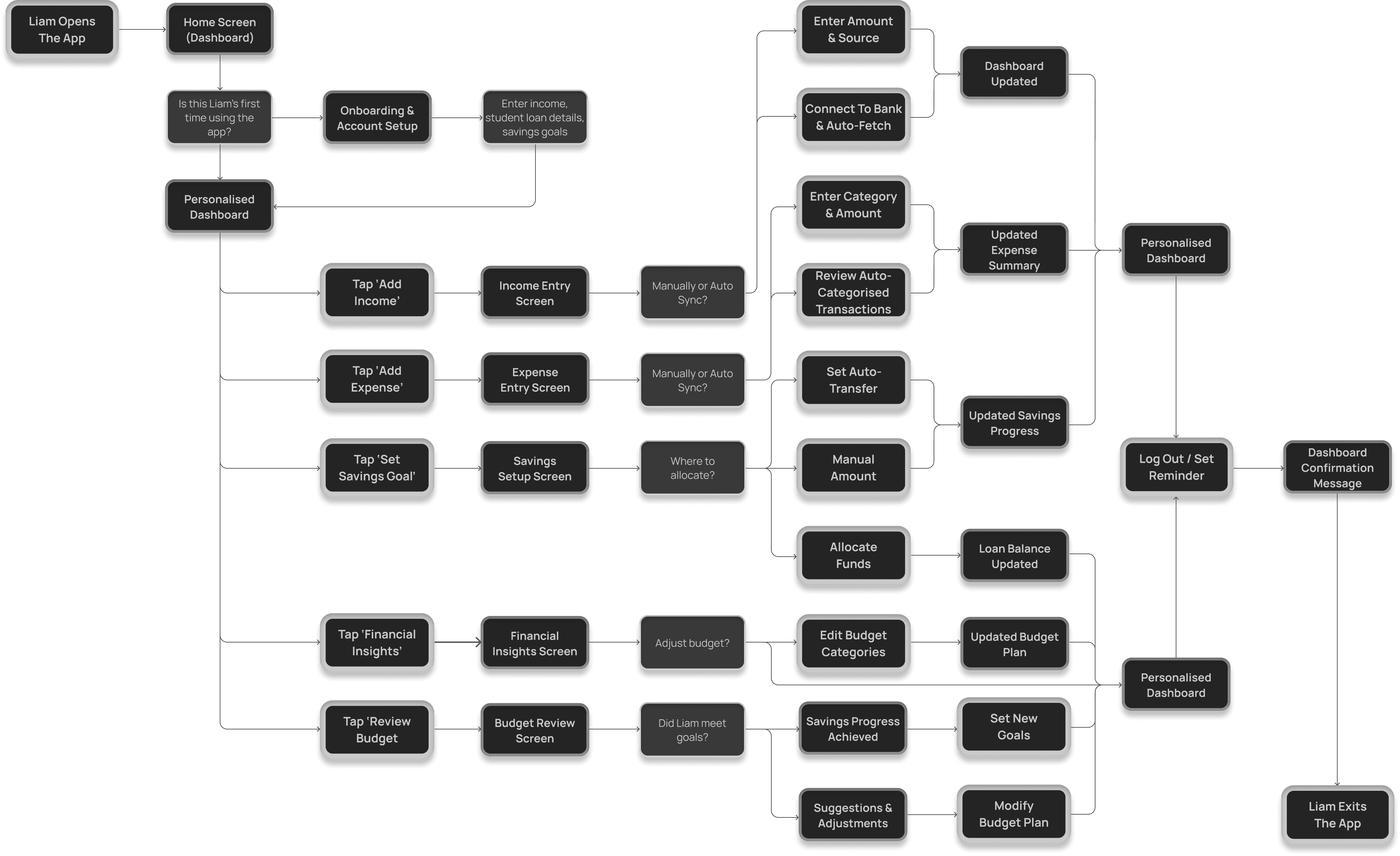 To ensure the product aligns with the needs of real users, I developed five personas during the research phase. After evaluating their goals, behaviours, and financial challenges, I selected Liam Thompson - a recent graduate and junior civil engineer - as the primary user for this case study.