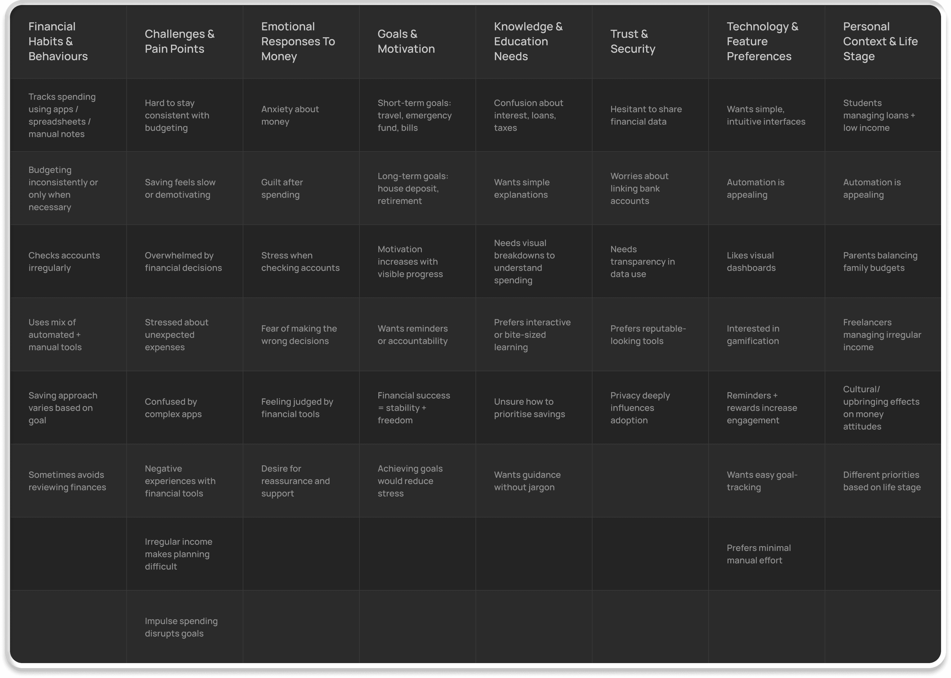 To better understand spending behaviours and financial pain points, I conducted 5 user interviews and a survey with 20 participants. This research was supported by competitor analysis, persona development, and journey mapping to uncover patterns in how users think about and manage money.